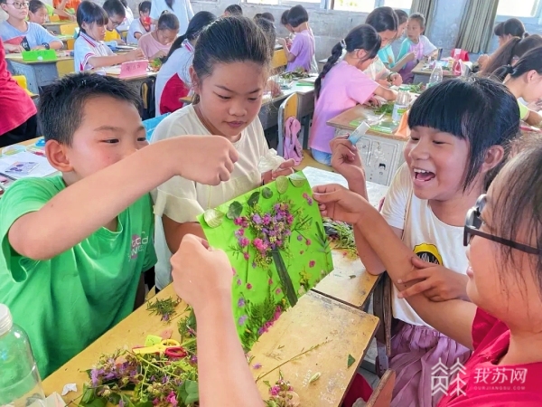 志愿者们将对小学的谢意藏在心中,落实在实践上。记起开营时的初次见面,小朋友们在惊讶与腼腆之中走向志愿者,伸出小小的手,牵起这一段相隔山海的情谊;在感念亲恩主题日实践活动中,通过上午主题课程的学习,学生对于亲恩有了更加深刻情感,在下午实践活动中,他们用孩童稚嫩字体写就信件,从自己至家人,“你会考上大学吗?”“你会有一份好工作让爸爸妈妈不用到远远的地方打工挣钱吗?”“最疼爱我的爷爷是不是还陪着我呢?”他们认真憧憬的模样与郑重其事一笔一划的书写,让支教志愿者无限的触动与感慨;小学学校坐落于乡村之中,周围有小树林,小溪,青草地,在探索自然活动日当天,刚好天公作美,天气晴朗,支教志愿者们带领小朋友们穿梭暖阳林树、在鸟鸣花红之间,采摘五彩缤纷的花儿与各种各样的绿叶,这些自然馈赠,在志愿者们的引导下与小朋友的奇思妙想中,制作成为一幅幅锁住自然的童年画作;更有那些角色扮演的声声起伏笑语;探索广袤宇宙的不时轻叹;家乡伟人事迹,源远流长民俗的感悟学习;活力满满,趣味益趣的运动会的快乐参与;更有整个夏令营心驰神往的少年向团心主题汇演等等。志愿者们的青春支教故事,在每天的紧张而又充盈主题授课与特色活动之中,与乡村儿童建立了深厚的情谊,填满了无数难以复刻的珍贵回忆。