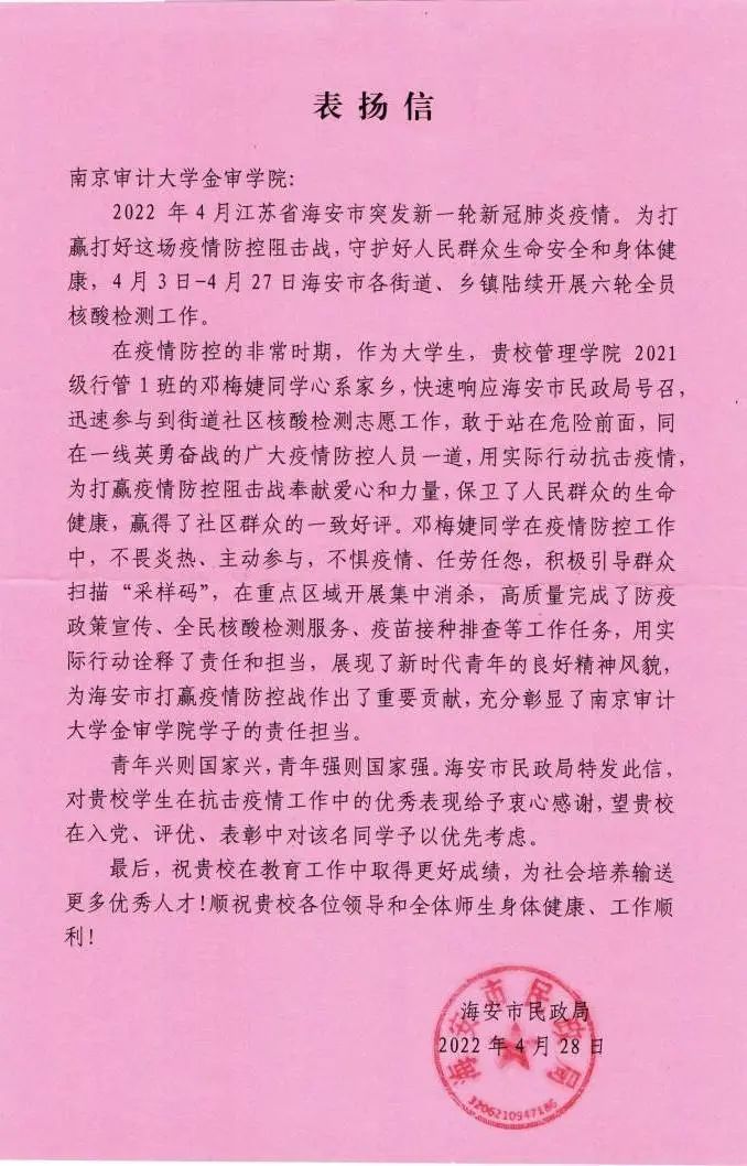 这次的南京疫情爆发突然,在学校的统一领导下,根据学校封闭管理等一系列整体要求,我积极响应,认真落实,以饱满的热情加入了“抗疫防疫”志愿活动。校内我积极参加食堂执勤和查寝活动,从2月至今一直没有缺席。每周两次,按时到指定的食堂内进行执勤服务。正是一件件微小的工作建立起防疫的大网,保障了全校师生疫情间的安全。在校外我积极响应中国共青团、大学生驻外团工委联合发出的号召,在共青团的指导下,积极投身于抗疫青年志愿者队伍。