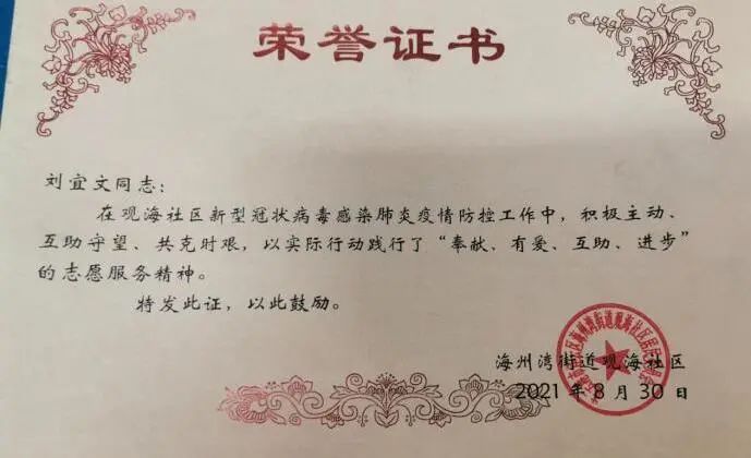 20217月末到8月初我报名参加了邳州市团市委组织的疫情防控“青春有你,战役同行”志愿活动,我工作的主要内容是疫情防控卡点的志愿服务,有序开展询问摸排、卡点测温、秩序维持、信息登记、政策宣传等工作。共计15次,获得了团市委颁发荣誉证书。20218月份报名参加了持续3天全民核酸的志愿者活动,早上5点到岗执勤,晚上12点休息,服务引导广大社区人们有序进行核酸检测活动。返校后,我积极报名参加了学校组织的疫情防控志愿者活动,在安排的巡逻岗位上一丝不苟地完成了自己的工作。