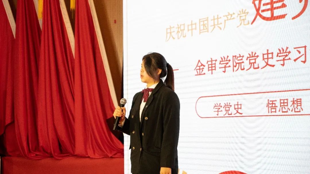 会计与审计学院的代表陈昱晗同学以自制短视频的方式,介绍了来自她的家乡宿迁的第一位中共党员——吴苓生烈士的红色故事。她亲身前往烈士陵园,拍摄视频,并前往拜访了吴苓生先辈的后人吴永明先生,通过多角度的探访,她将吴苓生被捕后面对严刑拷打毫不畏惧的形象立体地展现在了同学们的面前。