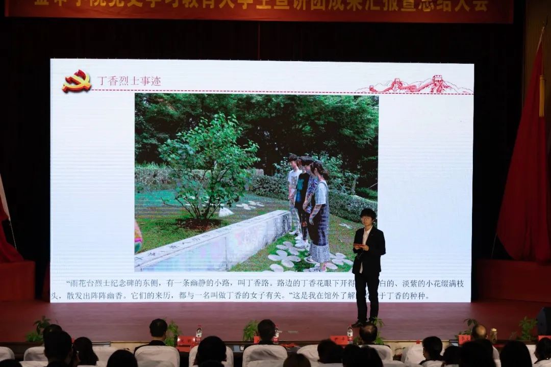 优秀指导老师代表李丹首先对学生宣讲团的汇报工作表示了赞许,同时以五个重点对宣讲团的工作收获作出总结。最后,李丹书记对大学生们提出了一点希望:认真仔细地学习中国共产党的历史,做红色故事的传述者,做红色精神的传承者,做新时代的建设者。