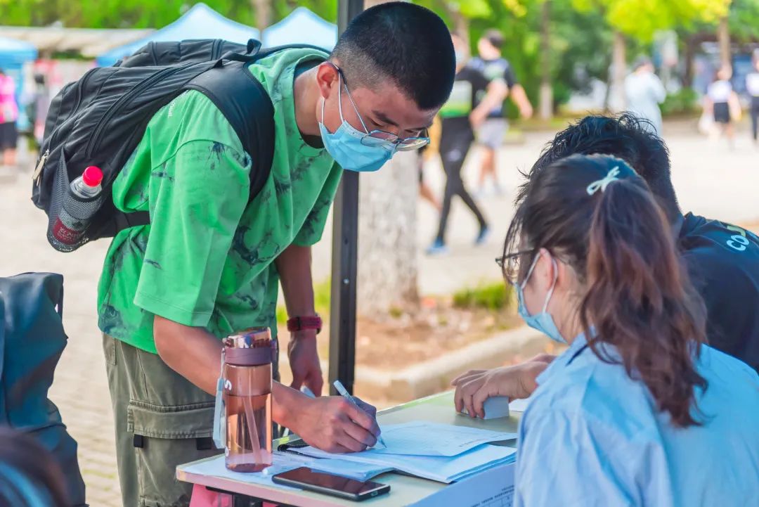 各个学院在石头广场设立了报到点,新生在志愿者的带领下办理入学手续,填写好个人信息后,领取校园卡、宿舍出入证以及军训物品。各学院志愿者热情地向新生们介绍他们即将生活学习四年的金审校园,让22级新生感受到了家一般的温暖。